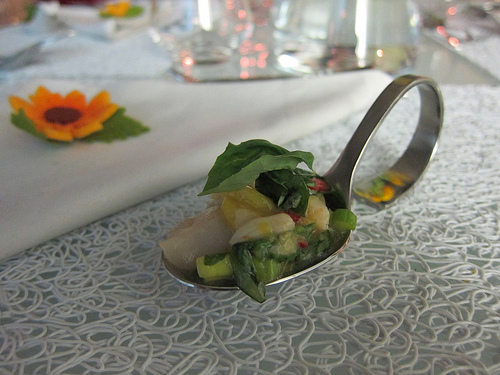 After chatting with some newfound friends, we sat down and had the scallop and mango spoons. We had brought a bubbly and a white wine and decided to continue with the prosecco.