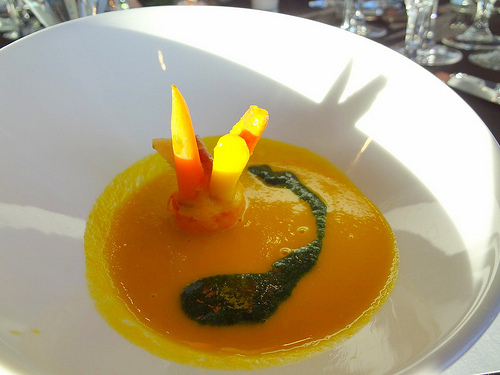 We started with a warm spring baby carrot and cilantro soup. The soup featured a cluster of baby carrots in a ginger dressing. Even though I’m not fan of the orange vegetable, this soup had my attention.