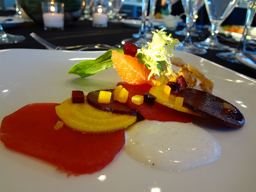 Next we had the ahi tuna and baby beet carpaccio with pickled papaya, baby arugula, clementine, whipped goat cheese and orange blossom honey.