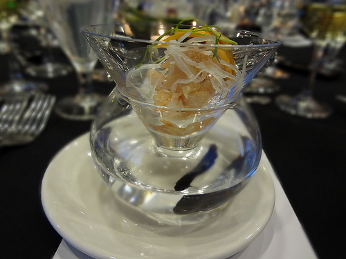 Next we were dazzled by the sweet and sour lobster salad (are we only on course 5?!). It arrived with a live beta fish swimming in the lower bowl. Check out this video I have with Chef Chris explaining the sweet and sour lobster salad and my overall reaction to the presentation.