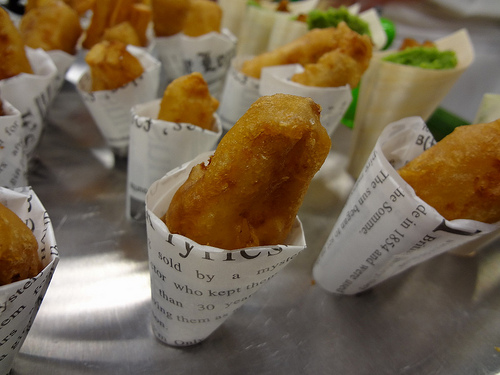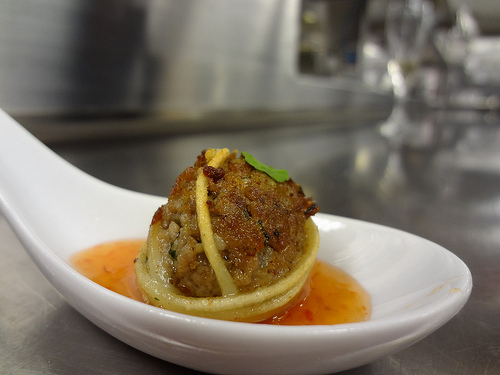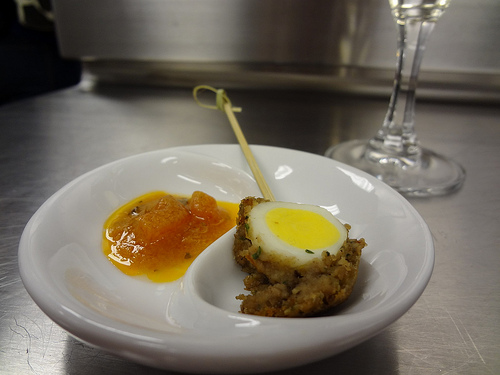 There is just something so fun about having miniature foods. The spaghetti wrapped-meatball, Scotch quail egg and portions of fish and chips. The Scotch quail eggs were wrapped with ground lamb “koftas.” A bit of an international flair on this dish!