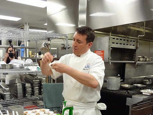 While we were in the kitchen, Chef Chris demonstrated how to get the potato baskets. First he used an Asian vegetable peeler to create strips, then he wrapped it around a cucumber and deep fried it to create the tube. The black bass was also served with eggplant caviar and bok choy.
