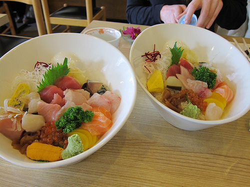 I’ve been hearing about Toshi Sushi‘s chirashi bowls as a great value for some time now. I finally made it over there a couple of weeks ago. We grabbed a table but there is a sushi counter for those who want to pick their own and gab with the sushi master.