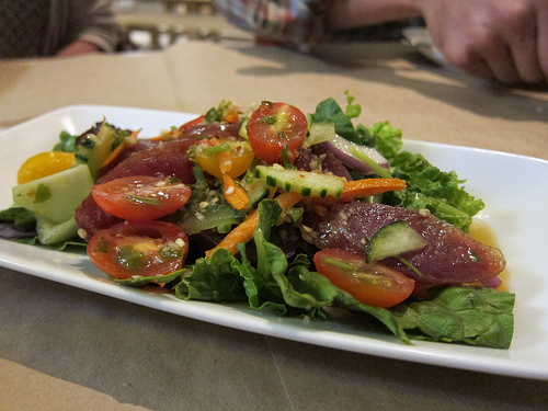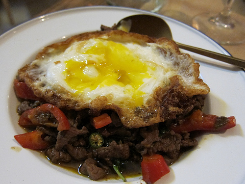 The sausage salad was sent out on the house. It was a very refreshing salad, with clean flavors. We couldn’t resist the beef grapow with fried egg. Actually, you can have anything with a fried egg for just an extra $2.
