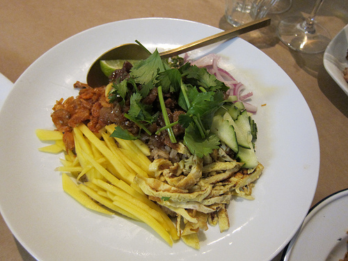 I’ve been experimenting with more “top down” food shots. I’m not sure I like these pics but it gives a better picture of what was going on. The drunken noodles were served with the most tender short ribs. Everyone went crazy over the shrimp paste seasoned rice. The flavors were just so unexpected. I really liked mixing it all up with the tiny dried shrimp, the slivered mango, onions, cucumbers and rice.