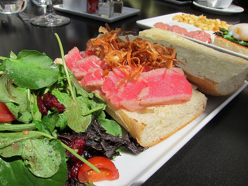 I like that Vu is a bit unusual for their brunch options. The Ranch Eggs features slow-cooked eggs, hominy, corn nuts, chipotle aioli, beans and the cutest mini-tortillas. If lunch is more your thing, there’s an ahi tuna sandwich that is lavender and juniper seared served with black truffle aioli, crispy parsnips and sea salt potato chips.