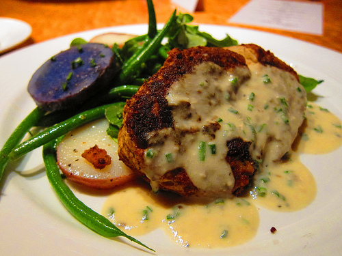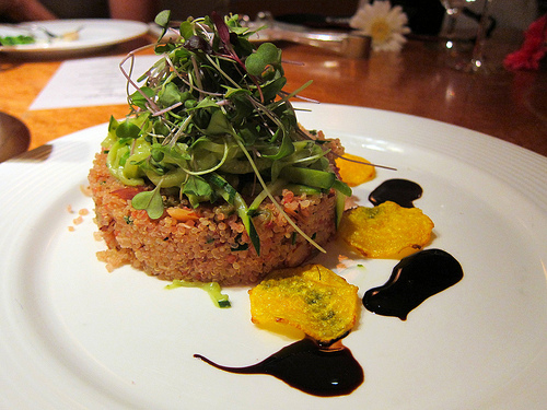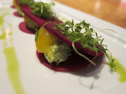 We started our meal with three dishes including the Beet Carpaccio, Wild Field Greens and Macadamia Caprese. When I was dating The Vegan, he had told me once it was fairly easy for him to eat vegan but then ruined the notion I could because mainly he ate raw and very little processed food products. I couldn’t help but think it’d actually be easy for me if I ate salads like these. The Beet Carpaccio was made with an edamame hummus, mango emulsion and garnished with an herb infused olive oil. I loved the presentation of this dish. Vegans differ from vegetarians by avoiding all animal products. So no cheese for them. The chef has come up with his own “cheeses” by making them out of nuts and soy products. The Wild Field Greens salad of market greens, dried cherries and blueberries, sunflower seeds and warm blueberry vinaigrette. The house-made tofu “ricotta” cheese is scattered on top. I enjoyed the rich nutty flavor.