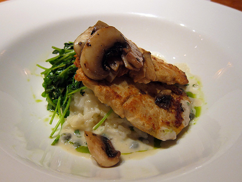 This is not to say it didn’t taste good. The Gardein “Chicken” Scaloppini is normally served at lunch. The “chicken” is dusted with a spiced flour and pan-fried. It’s served with garlic pea shoots and asparagus-meyer lemon “cream.” I liked the mushrooms in this dish as well but I am a fiend for mushrooms.