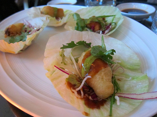 Of the initial offerings from the bar menu, I was most impressed with the chow fueng (rice noodle) rolls. Growing up, I ate dim sum at least twice a week. I invariably wanted shrimp chow fueng because the beef never seemed very interesting to me. If they had made it with Kobe beef cheeks, that would have been a different story. I also liked the baby bao buns and everyone raved about the crystal dumplings.