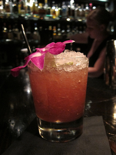 A friend started with the Last Minute Fix (tequila, house hibiscus-vanilla cordial, lime, sloe gin, Castillian bitters). It’s a very pretty drink that came adorned with an orchid which she wore the rest of the night.