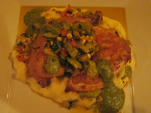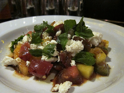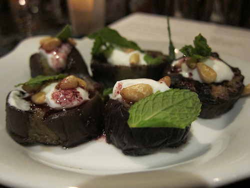 Over the course of three days, I tried a number of things including the grilled eggplant and heirloom tomato & watermelon salad. The grilled eggplant is chilled and served with lebni (a yogurt sauce), pine nuts, sumac oil and mint. I liked these and they went quickly. The tomato and watermelon salad is a light salad for summer. I personally like watermelon salads (like Rivera’s shrimp and watermelon mojito salad) and also have a great love of heirloom tomatoes. It was a bit of an adventure though figuring out what I was eating because BK uses yellow watermelon. It was like a surprise bite with every mouthful.