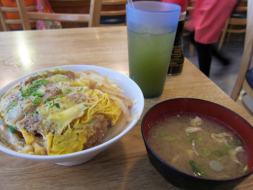 You start off with a familiar bowl of soup though the soup had thinly sliced pieces of an omelet instead of the usual tofu. Ah, egg and egg! Someone once told me they could never eat chicken katsu don because they thought eating the “mother” and the “child” was cruel. Good thing I choose pork over chicken almost every time.