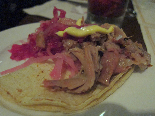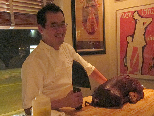 Lindy & Grundy look on as Chef Haru carves out meat for pork tacos. (I really apologize to Erika for the awful photo of her– I don’t know where that shadow came from).