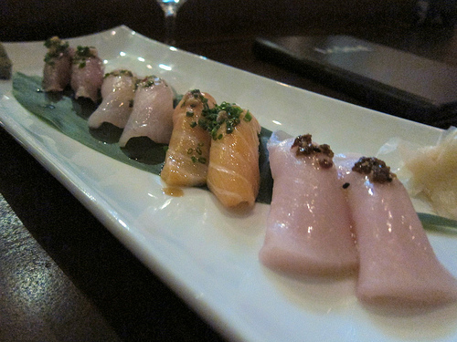 I was eating with a friend who may be leaving the restrictions of vegetarianism and becoming full-blown opportunarian. Take the opportunity to try anything! I ordered us salmon, yellow tail, kanpachi (amberjack) and Spanish mackerel. The amberjack was my favorite then the Spanish mackerel. I really liked that these weren’t traditional nigiri. The various sauces meant I didn’t have to add soy sauce if I didn’t want to.