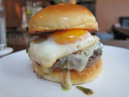I was going to order the diner style burger from the bar menu but our bartender suggested the “secret” burger with New Mexican chiles and fried egg. Fried egg you say? Bring it!