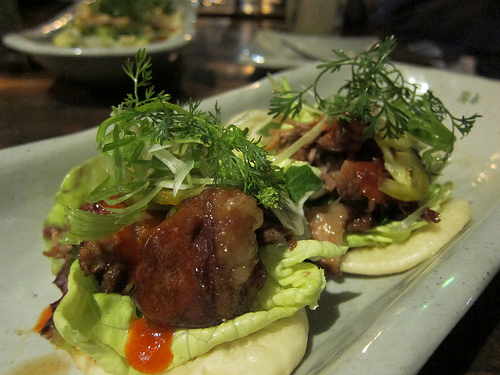 Normally the ssam (open faced sandwiches on steamed bao — buns) are much larger than pictured. The restaurant gave us these individually-sized ones. We tried two of the four on the menu; the grilled prawns with avocado and the sweet soy braised pork which was my favorite! The other two are sesame duck confit and green chili pork sausage. Both sound amazing. MoKo is offering a great deal during their Social Hour (happy hour). Get a ssam and Hite beer for only $10.