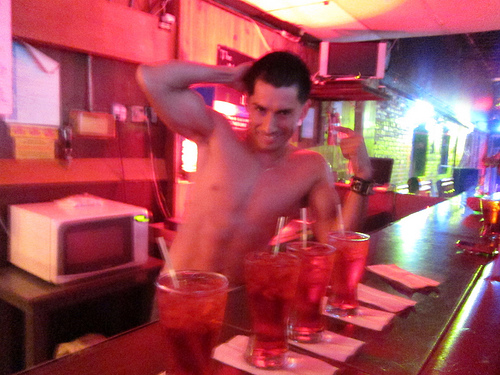 Are you sick and tired of not knowing what your bartender looks like in the nude? Well, head on over to New Jalisco where Tony runs around half naked. He told us he works out 5 days a week so why shouldn’t he show off his abs? By the way, he also is a go go dancer at Mickey’s in West Hollywood so catch him there on Wednesdays. I didn’t quite catch where he is on Saturdays but he’s definitely at New Jalisco on Fridays. You can even shove a few bucks down his pants if you feel like it. He likes that.