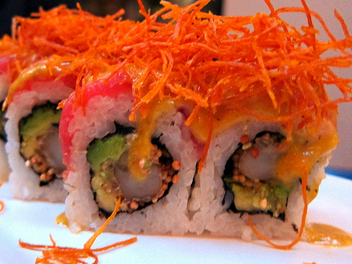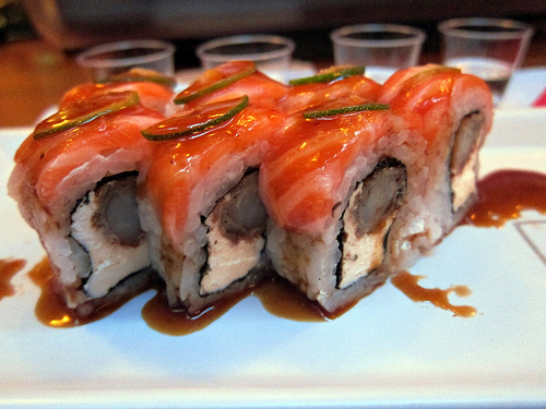 The scallops were very good as was this roll topped with salmon and thinly-sliced jalepeno. I never thought I’d like a cream cheese roll.