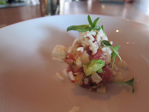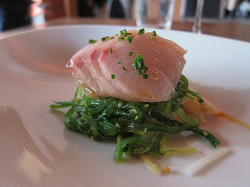 We got the tasting menu and despite the fact we were inundated with a bunch of menus (bar, 2 cocktail lists, wine, dinner menu), there is no printed tasting menu. For our first course, two raw fish appetizers were sent out- the yellowfin tuna and yellowtail sashimi. Since Carina and I were sharing, we figured the 5-course menu was really more like 10-courses since we were getting different things each course. I really liked both the yellowtail sashimi with seaweed and yellowfin tuna with the avocado and fried rice (more like puffed rice).
