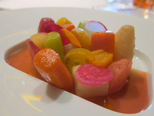 Patina Executive Chef Tony Esnault sent out the Seasonal Vegetable Mosaic. At first we didn’t think much of it but each of the 14 different vegetables had its own flavors that ultimately made this the most remarked upon dish. Vegetables! It was paired with a pinot noir which also surprised me because I didn’t think to pair it with such but the savory stock really went well with the medium red.