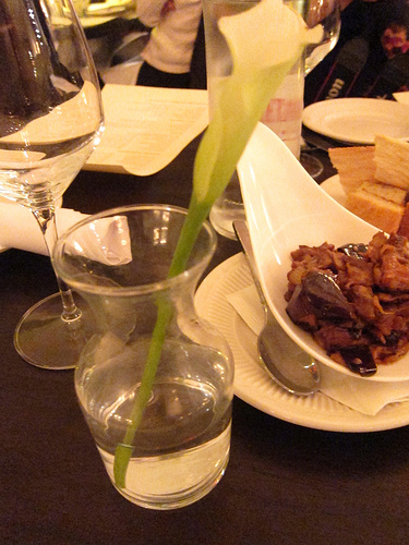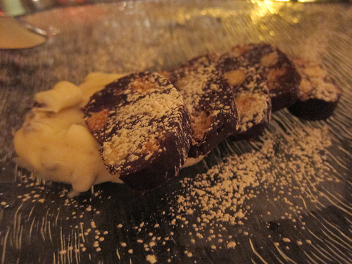 We were at the end of our three courses but the chef’s spidey senses must have been tingling. We heard about the fabulous chocolate salami but it wasn’t on the menu this night. As it turned out we got a little surprise dish of it at the end. Hurrah! The cream is the cream usually stuffed into canolis and the chocolate had big chunks of pistachios which I really liked. And vegetarians, it’s not really “salami” like meat but rather it’s shaped and sliced like such.