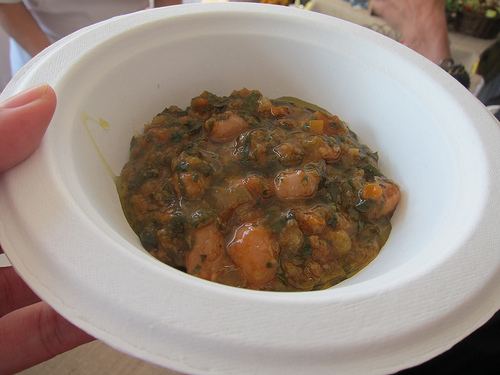 I had skipped Jonathan Waxman’s booth because he had a raw vegetable and blood orange salad I love veggies but at food festivals, there are certain things I just don’t eat. Need more pork! I spotted Chef April Bloomfield from the Spotted Pig in New York and thought surely she had something swiney. Actually, she brought a warming savory stew, the ribolita. I saw “rib” and thought it was meat based. I was a bit amazed it was so tasty but entirely vegetarian. As the recipe card says, it’s thick, creamy and delicious!”