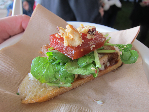 When I first got there, everyone told me to head to the second tent where Sotto was for the pork belly. Chefs Steve and Zach were doing their crispy pork belly porchetto with myrtle and quince mostarda.