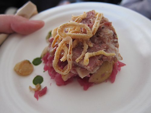 Chef Maria Hines from Tilth in Seattle made a bold choice by bringing a smoked corned beef salad with crispy shallots and fingerling potatoes.