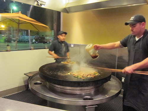 After adding sauces and noodles (or you may opt for white or brown rice), you bring your bowl to be cooked on the large round flat grill.