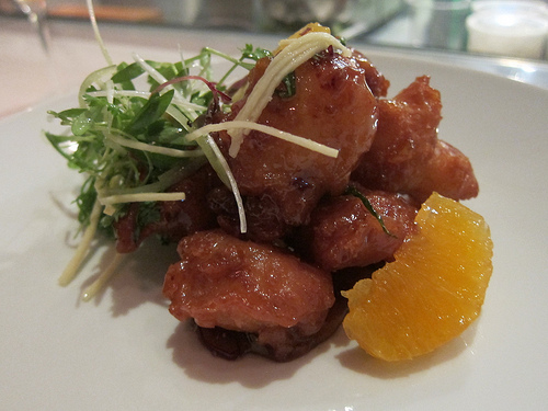 I love it when friends allow me free rein over ordering so after I picked out my favorite baby Monterey squid stuffed with sausage, I also chose the sweetbreads “orange chicken style” and duck popiah having never tried those. We particularly loved the duck popiah. Full of meaty, silky duck, my friend remarked this would be good on its own for lunch. Although I am not a fan of orange chicken, I wanted to try the sweetbreads done that style. I thought the orange chicken sweetbreads were interesting. Very light and crispy.
