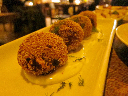 I took the Opportunarian to the Gorbals for her birthday back in late October. She had never been and I thought it’d be fun for her to try some of the more intense offerings at the Gorbals. Naturally we had the bacon-wrapped matzoh balls which are always fluffy and delicious. She wanted the garbanzo beans and cucumber salad which is a nice light starter.