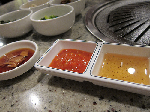 We were automatically given beef brisket (chadol) and pork belly. I liked that the meat wasn’t very frozen but frowned when I realized the sauces weren’t the traditional gochuchang (spicy) and doenjang. I ended up asking for the doenjang (fermented soybeans) which they generously gave us a lot of. I need all the sauce I can get for the grilled meat!