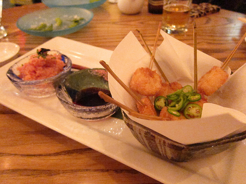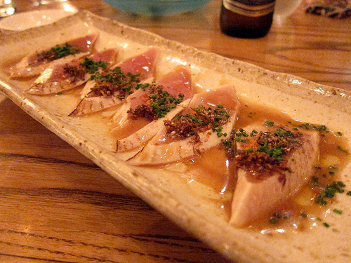 Both Ali and AK told our server I would be doing the ordering. I felt a bit rushed and let him badger me into ordering for us. I didn’t want to take too long with the extensive menu but the things he ordered for us wouldn’t have been anything I really would have ordered as I feel these dishes are found at many Japanese restaurants. I wanted something unique, something like that uni tempura which I inisted we wanted. We began with the yellowtail with chiles which was good, not at all spicy. I have had similar versions around town and this was very saucy.
