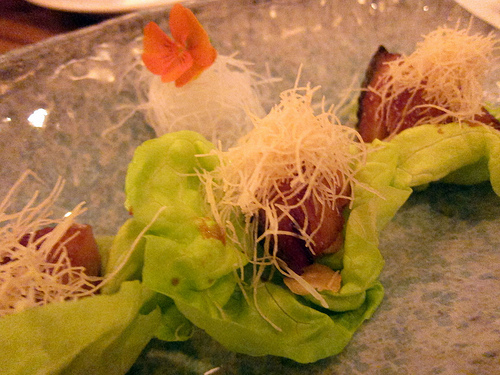 Next was another familiar fusion-y sushi (sashimi) dish, the albacore with garlic chips. Also good, nothing spectacular. Just really good quality fish.