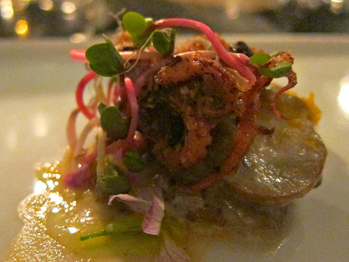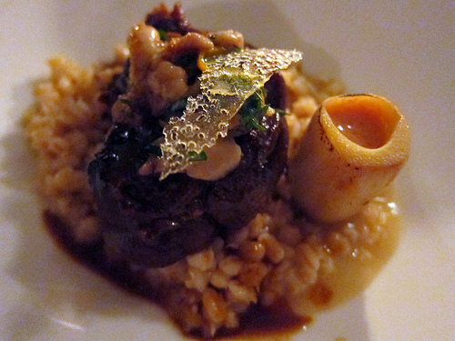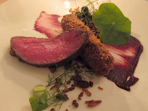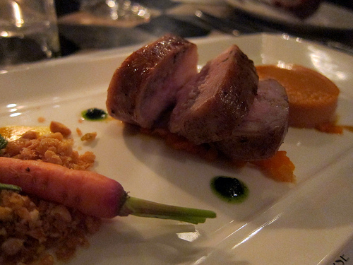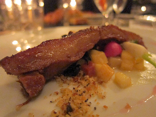 After we were seated, bubbly was immediately given to us while we waited for our food. The amuse bouche was octopus. We joked it must have been the “wild game” of the sea. After some time had passed, the roasted rabbit arrived. The three pieces came with carrot panna cotta and a tiny carrot. I was a bit startled to find the rabbit was cold but figured it was supposed to be that way? It was indeed tender and I thought the Thai spices, peanut and lime must have been inspired from Chris and Jo’s lunch at Jitalada (Jo’s “home away from home”)where the plan was hatched for this dinner.