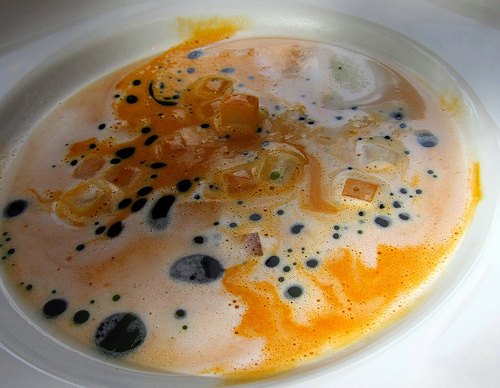 The other choices are the lobster bisque and tuna tonnato for the first course. The lobster bisque was a work of art. It was almost too pretty to disrupt the Jackson Pollack-looking surface.