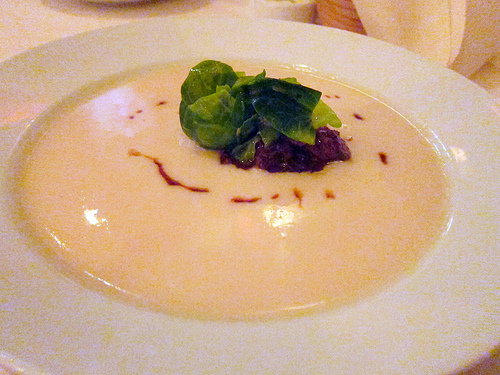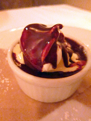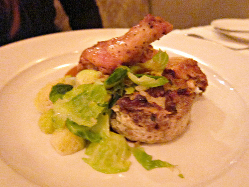 I didn’t really get a good shot of the Brittany salt-crusted Jidori chicken. The round thing in front is the savory sausage bread pudding. I had a bite of the chicken and it’s fine. Probably not as juicy as other roast chicken dishes I’ve had before. I thought the Brussels sprouts that came with it tasted boiled and watery.