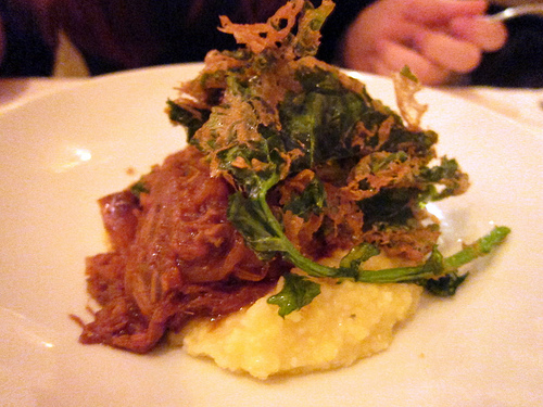 I opted for the cauliflower soup with braised short ribs. I was torn between that and a salad. I was starting to feel the effects of multiple dineLA meals in a day but of course I went with the soup because it’s more interesting. It was an ideal starter, light and hearty at the same time with the addition of the short ribs. My dining companion had the oxtail ragu which she found a bit salty and thought the polenta was on the thin side.