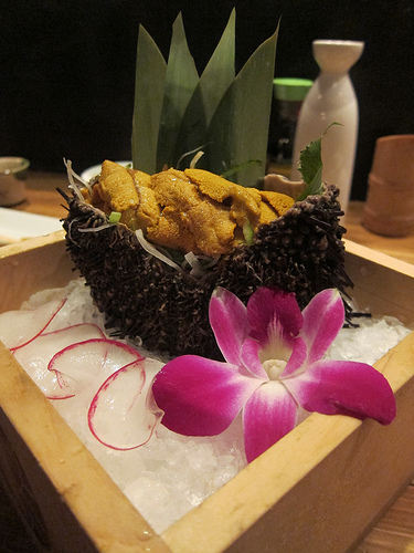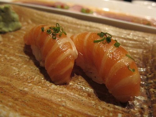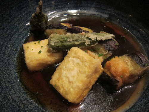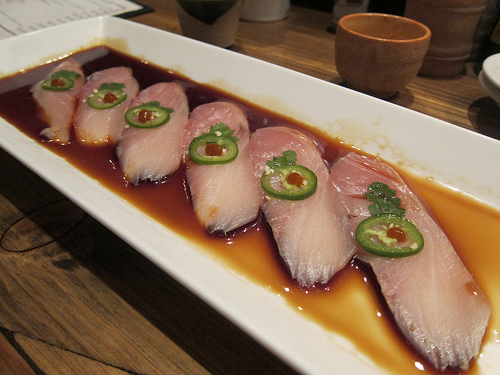 We started with an array of raw stuff including uni, hamachi and salmon belly. I loved the salmon belly. The cute nigiri looked like the striping of a Cheshire cat. We also liked the uni. I felt the hamachi was sliced a little bit too thinly but I’m a bit of a fiend for raw fish.