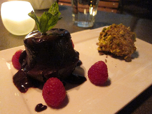 We weren’t going to have dessert but let our server convince us we had to try the Black & White and the Donuts. The Black & White was a warm flourless chocolate cake with vanilla ice cream studded with pistachios. It was an instant hit. And how can anyone not love fresh hot donuts with Irish Coffee cream?