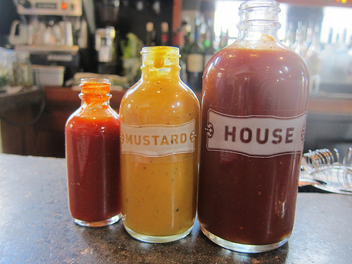 I sat at the empty bar for lunch and was soon joined by a few other single diners. We were intent on ordering BBQ. I decided that going for the 3 meats combo was the best option and it was only $16 for the three meats. I opted for ribs, brisket and a house-made jalepeno hot link. A trio of sauces was given to me. None were really spicy and I tried all of them with the different meats. I liked the small bottle that was more on the vinegar-y side for most things. The mustard went great with the hot link and the larger jar was of course perfect with the maple and coriander crusted pork ribs.