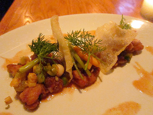 But no, I knew I couldn’t eat all that much food. The crispy sweetbreads with a pickled vegetable salad and pine nuts was just right. Beautifully composed, it was my sort of dish.