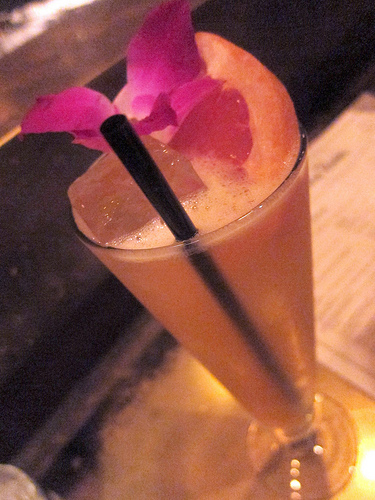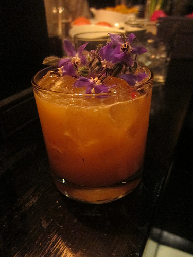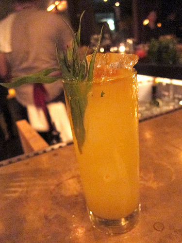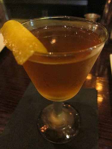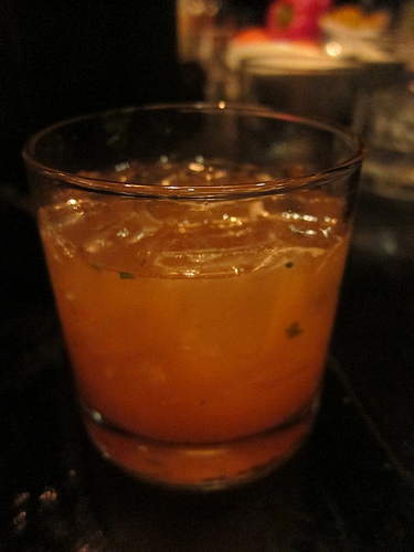 My friend asked for a Blood and Sand and Stefanie Seifer, the bartender asked if we were into craft cocktails. My friend mentioned I was and so the bartender asked me for the specs. I knew basically what was in it but not the proportions. In case you ever want to make it at home, it’s .75 oz each of Scotch, Orange Juice, Cherry Herring and Sweet Vermouth. After tasting it, I would actually probably do a bit more Scotch and cut down the OJ. But I like my drinks less sweet. I would never be that specific at a bar though as that’s probably annoying to a bartender. I was drinking a Derby (Buffalo Trace bourbon, Benedictine, Peychaud’s bitters, flamed orange) and was ready to try something else.