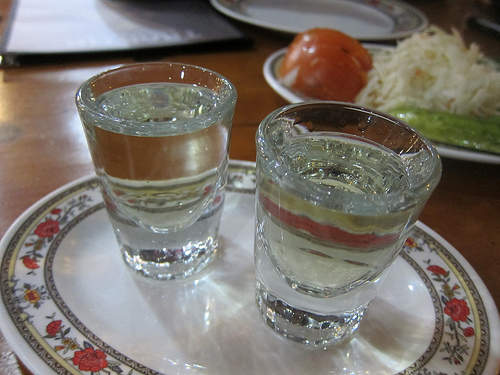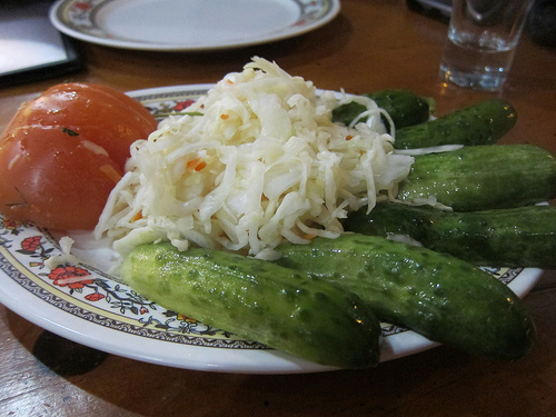 I’ve driven by Traktir in West Hollywood for years and have always been curious about this Ukranian-Russian joint. I finally had a chance to go a couple of weeks ago. It is apparent from the moment you walk in that it’s an authentic place. We started off with chilled pepper vodka. And before you even say it– yes, pepper vodka. It’s actually a fairly traditional flavor for vodka and if there’s ever a time to have vodka, it’s with Russian food.