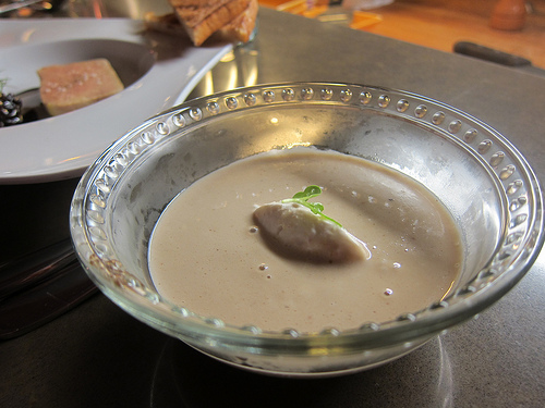 We decided to share most of our courses. Although I really also wanted the soup, I felt it was important my friend get first dibs so she too could worship the shrine of Gary’s soups. This mushroom veloute with cream cheese “dip” and farinette was of course a hit. But don’t feel bad for me. My consolation prize? Foie Gras.