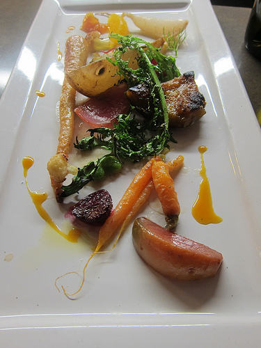 With 14 different vegetables and fruit on the plate, this was a vegetarian delight. I was really into the root veggies but found the fruit to be a welcome change in flavor. The beets and fava beans were also great.