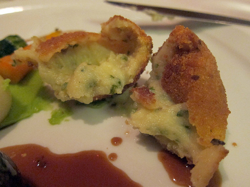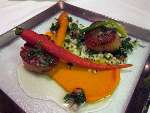 Next we had the Eastern Diver Scallops. The two perfectly seared scallops came with Israli cous cous, tobouleh, baby carrots, scallions, harissa carrot lime puree and a coriander vinaigrette. My friend was fascinated by the rainbow carrots. Chef shops at the farmers’ markets for them.