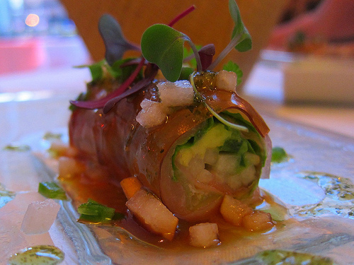 Leatherby’s was offering a 3-course menu in honor of Alvin Ailey but we had the 5-course tasting menu. We began with the Hawaiian Kanpanchi. The fish is wrapped around avocado and romaine lettuce. There’s also ginger, jalepeno, Asian pear, wasabi oil and yuzu soy gelee. It’s a work of art.