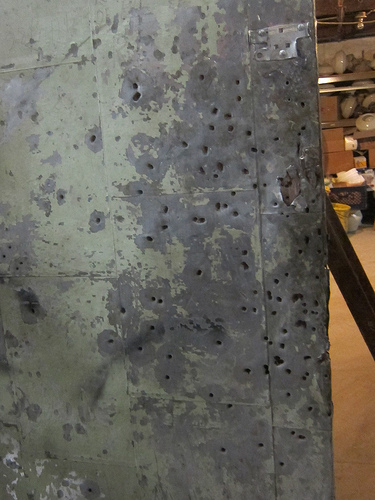 We got the full tour and after the kitchen, we headed downstairs to the basement. We saw the bullet hole ridden doors and I wondered about them. The bullets had gone through the metal clad wooden doors. This was an old bank. Was there a heist? We saw the safe with the tumbler removed but that probably came long after.