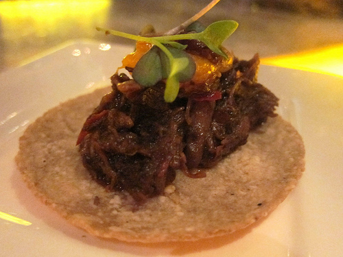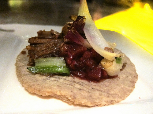 The pulled brisket taco features beef brisket studded with jícama and carrots, cooked in Tecate beer, habanero, charred red torpedo onions, pomegranate and served with pimento, toasted almonds and grilled baby leeks.